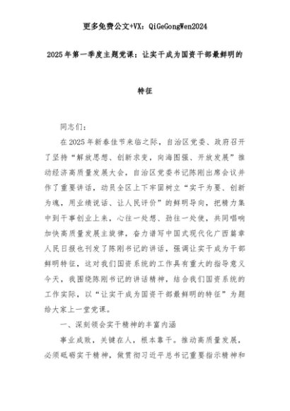 【七哥公文】2025年:2025年第一季度主题党课:让实干成为国资干部最鲜明的特征+更多免费公文+VX:QiGeGongWen2024+更多免费公文+VX:QiGeGongWen2024