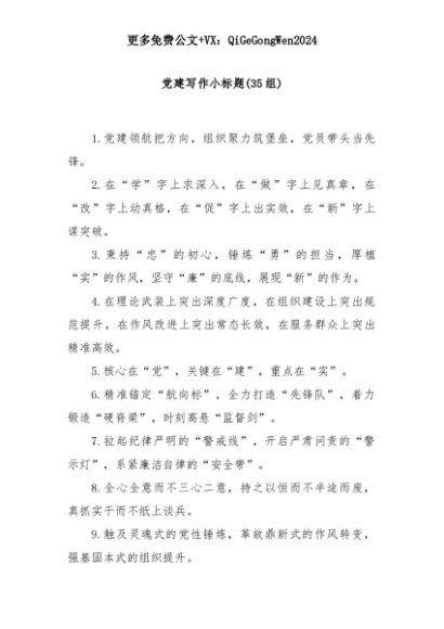 【七哥公文】2025年:(35组)党建写作小标题+更多免费公文+VX:QiGeGongWen2024+更多免费公文+VX:QiGeGongWen2024