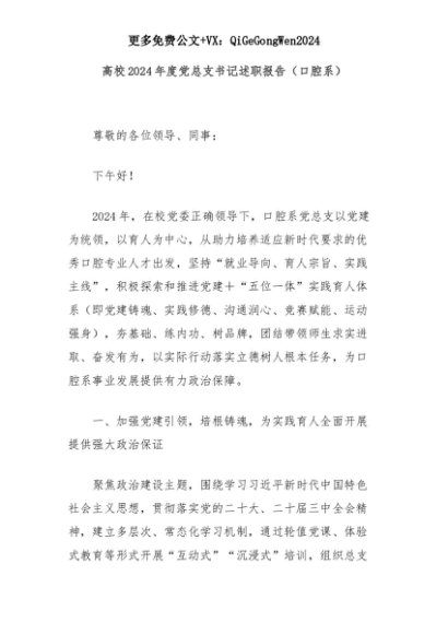 【七哥公文】2025年:高校2024年度党总支书记述职报告(口腔系)+更多免费公文+VX:QiGeGongWen2024+更多免费公文+VX:QiGeGongWen2024