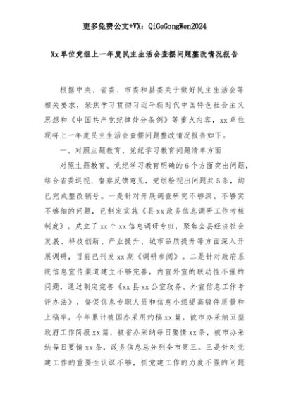 【七哥公文】2025年:Xx单位党组上一年度民主生活会查摆问题整改情况报告+更多免费公文+VX:QiGeGongWen2024+更多免费公文+VX:QiGeGongWen2024