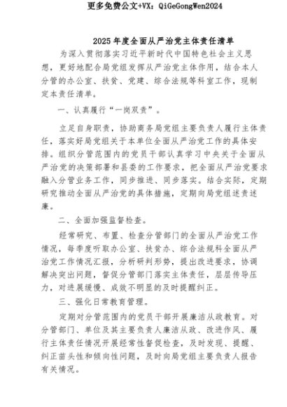 【七哥公文】2025年:(11篇)2025年度全面从严治党主体责任清单范文+更多免费公文+VX:QiGeGongWen2024+更多免费公文+VX:QiGeGongWen2024