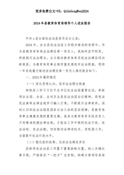 【七哥公文】2025年:2024年县教育体育局领导个人述法报告+更多免费公文+VX:QiGeGongWen2024+更多免费公文+VX:QiGeGongWen2024