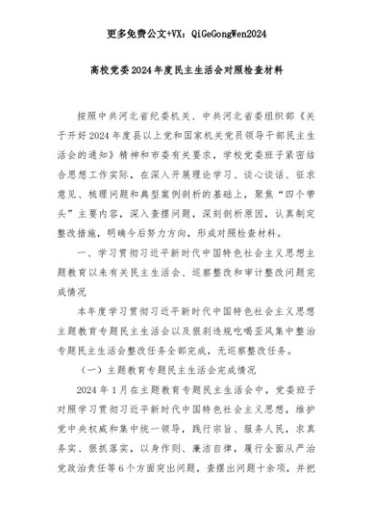 【七哥公文】2025年:高校党委2024年度民主生活会对照检查材料+更多免费公文+VX:QiGeGongWen2024+更多免费公文+VX:QiGeGongWen2024