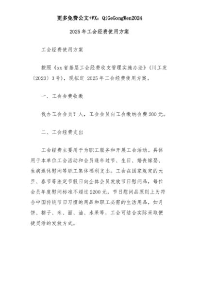 【七哥公文】2025年:2025年工会经费使用方案+更多免费公文+VX:QiGeGongWen2024+更多免费公文+VX:QiGeGongWen2024