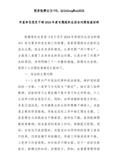 【七哥公文】2025年:市直单位党员干部2024年度专题组织生活会对照检查材料+更多免费公文+VX:QiGeGongWen2024+更多免费公文+VX:QiGeGongWen2024