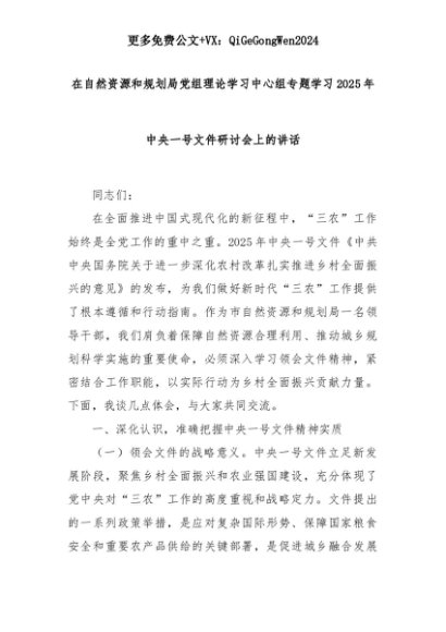 【七哥公文】2025年:在自然资源和规划局党组理论学习中心组专题学习2025年中央一号文件研讨会上的讲话+更多免费公文+VX:QiGeGongWen2024+更多免费公文+VX:QiGeGongWen2024