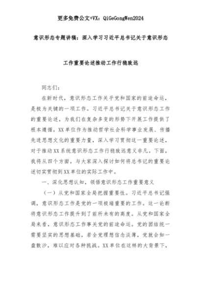 【七哥公文】2025年:意识形态专题讲稿:深入学习习近平总书记关于意识形态工作重要论述推动工作行稳致远+更多免费公文+VX:QiGeGongWen2024+更多免费公文+VX:QiGeGongWen2024
