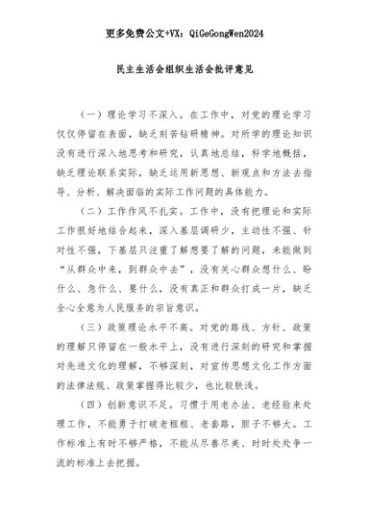 【七哥公文】2025年:民主生活会组织生活会批评意见+更多免费公文+VX:QiGeGongWen2024+更多免费公文+VX:QiGeGongWen2024