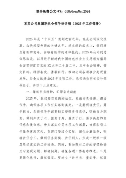 【七哥公文】2025年:某某公司集团职代会领导讲话稿(2025年工作部署)+更多免费公文+VX:QiGeGongWen2024+更多免费公文+VX:QiGeGongWen2024