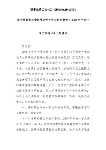 【七哥公文】2025年:水利局局长在党组理论学习中心组专题学习2025年中央一号文件研讨会上的讲话+更多免费公文+VX:QiGeGongWen2024+更多免费公文+VX:QiGeGongWen2024