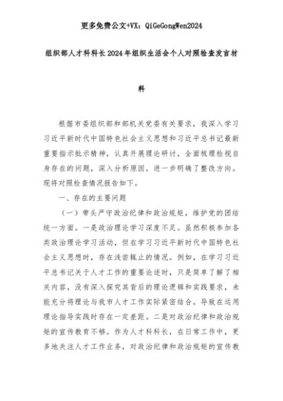 【七哥公文】2025年:组织部人才科科长2024年组织生活会个人对照检查发言材料+更多免费公文+VX:QiGeGongWen2024+更多免费公文+VX:QiGeGongWen2024