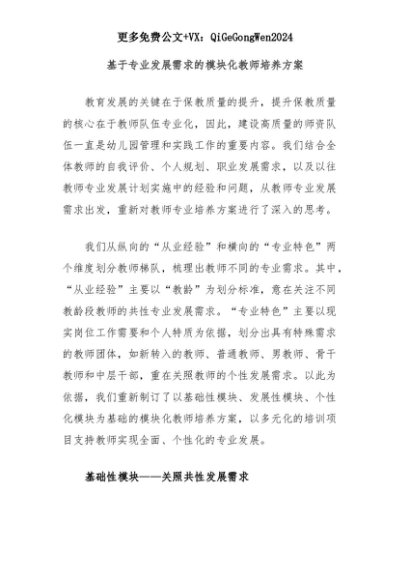 【七哥公文】2025年:基于专业发展需求的模块化教师培养方案+更多免费公文+VX:QiGeGongWen2024+更多免费公文+VX:QiGeGongWen2024