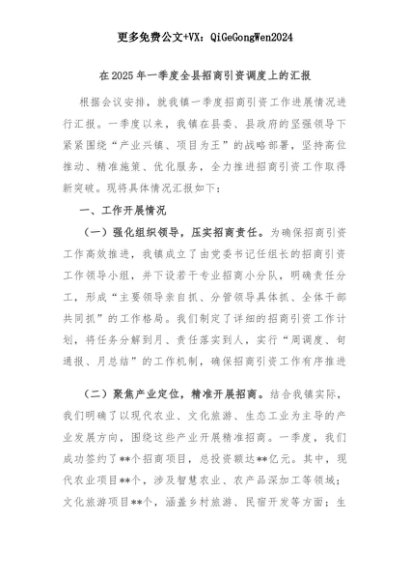 【七哥公文】2025年:在2025年一季度全县招商引资调度上的汇报+更多免费公文+VX:QiGeGongWen2024+更多免费公文+VX:QiGeGongWen2024