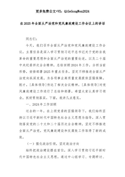 【七哥公文】2025年:在2025年全面从严治党和党风廉政建设工作会议上的讲话+更多免费公文+VX:QiGeGongWen2024+更多免费公文+VX:QiGeGongWen2024