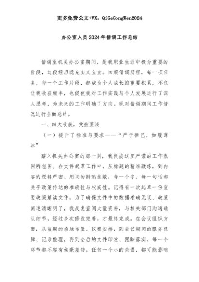 【七哥公文】2025年:办公室人员2024年借调工作总结+更多免费公文+VX:QiGeGongWen2024+更多免费公文+VX:QiGeGongWen2024