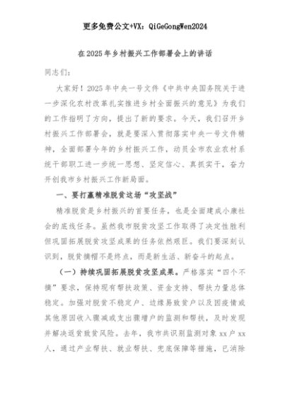 【七哥公文】2025年:在2025年乡村振兴工作部署会上的讲话+更多免费公文+VX:QiGeGongWen2024+更多免费公文+VX:QiGeGongWen2024