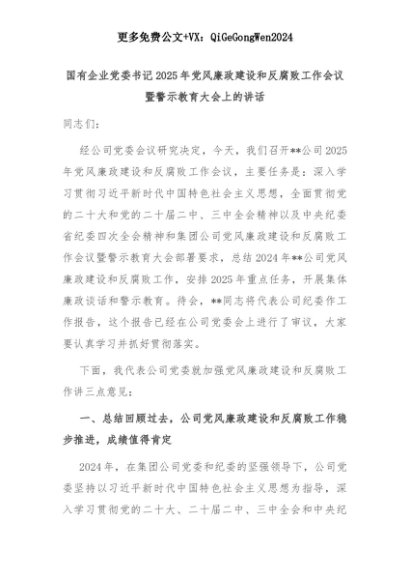 【七哥公文】2025年:国有企业党委书记2025年党风廉政建设和反腐败工作会议暨警示教育大会上的讲话+更多免费公文+VX:QiGeGongWen2024+更多免费公文+VX:QiGeGongWen2024