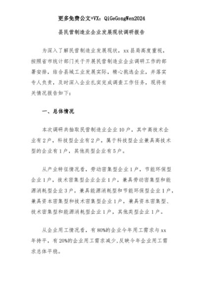 【七哥公文】2025年:县民营制造业企业发展现状调研报告+更多免费公文+VX:QiGeGongWen2024+更多免费公文+VX:QiGeGongWen2024