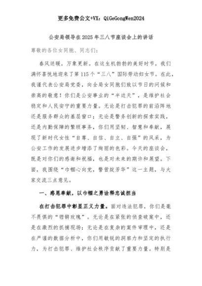 【七哥公文】2025年:公安局领导在2025年三八节座谈会上的讲话+更多免费公文+VX:QiGeGongWen2024+更多免费公文+VX:QiGeGongWen2024