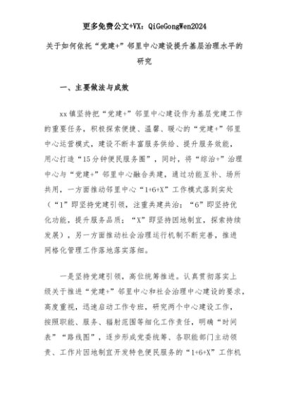 【七哥公文】2025年:关于如何依托“党建+”邻里中心建设提升基层治理水平的研究+更多免费公文+VX:QiGeGongWen2024+更多免费公文+VX:QiGeGongWen2024
