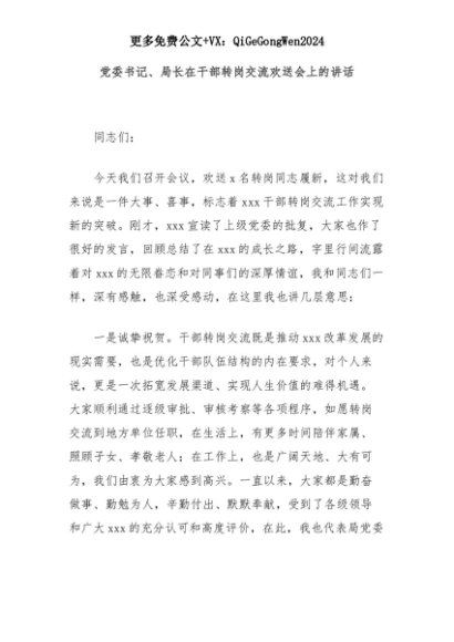 【七哥公文】2025年:党委书记、局长在干部转岗交流欢送会上的讲话+更多免费公文+VX:QiGeGongWen2024+更多免费公文+VX:QiGeGongWen2024