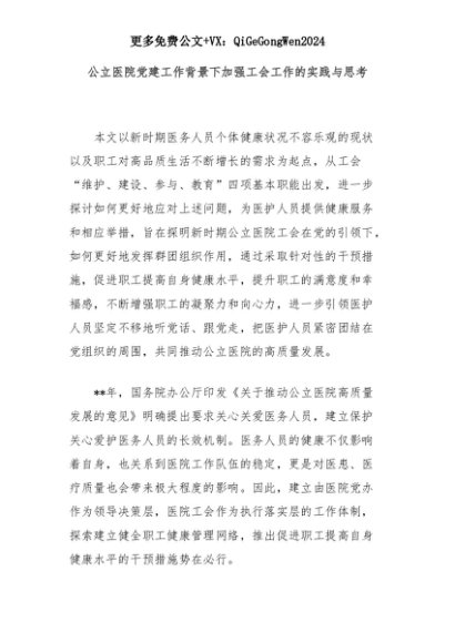 【七哥公文】2025年:公立医院党建工作背景下加强工会工作的实践与思考+更多免费公文+VX:QiGeGongWen2024+更多免费公文+VX:QiGeGongWen2024
