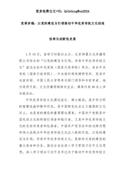 【七哥公文】2025年:党课讲稿:以党的建设为引领推动中华优秀传统文化创造性转化创新性发展+更多免费公文+VX:QiGeGongWen2024+更多免费公文+VX:QiGeGongWen2024