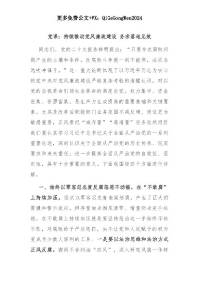 【七哥公文】2025年:党课:持续推动党风廉政建设 务求落地见效+更多免费公文+VX:QiGeGongWen2024+更多免费公文+VX:QiGeGongWen2024