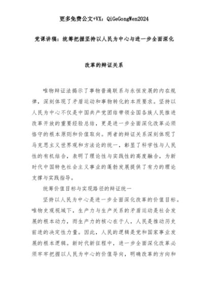 【七哥公文】2025年:党课讲稿:统筹把握坚持以人民为中心与进一步全面深化改革的辩证关系+更多免费公文+VX:QiGeGongWen2024+更多免费公文+VX:QiGeGongWen2024