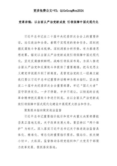 【七哥公文】2025年:党课讲稿:以全面从严治党新成效 引领保障中国式现代化+更多免费公文+VX:QiGeGongWen2024+更多免费公文+VX:QiGeGongWen2024