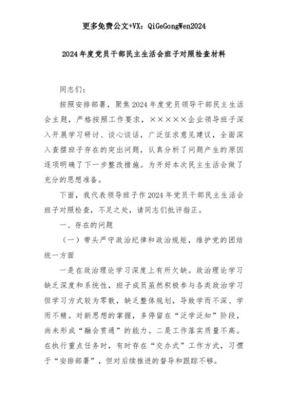 【七哥公文】2025年:2024年度党员干部民主生活会班子对照检查材料+更多免费公文+VX:QiGeGongWen2024+更多免费公文+VX:QiGeGongWen2024