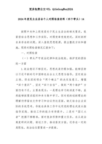 【七哥公文】2025年:2024年度民主生活会个人对照检查材料(四个带头)14+更多免费公文+VX:QiGeGongWen2024+更多免费公文+VX:QiGeGongWen2024