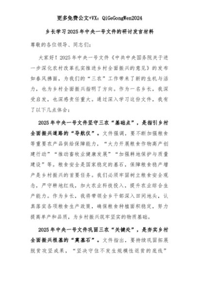 【七哥公文】2025年:乡长学习2025年中央一号文件的研讨发言材料+更多免费公文+VX:QiGeGongWen2024+更多免费公文+VX:QiGeGongWen2024