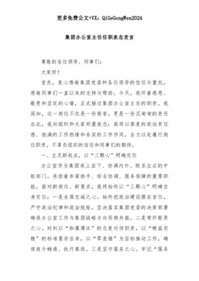【七哥公文】2025年:集团办公室主任任职表态发言+更多免费公文+VX:QiGeGongWen2024+更多免费公文+VX:QiGeGongWen2024