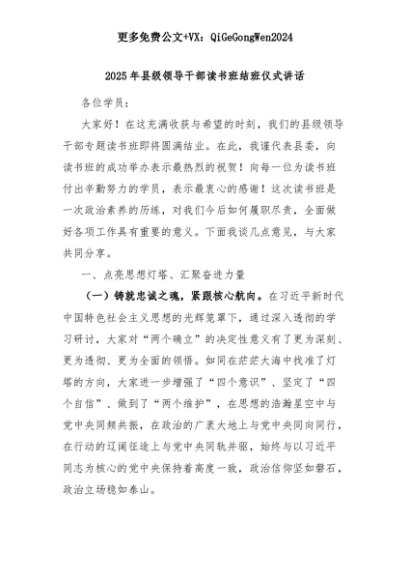 【七哥公文】2025年:2025年县级领导干部读书班结班仪式讲话+更多免费公文+VX:QiGeGongWen2024+更多免费公文+VX:QiGeGongWen2024