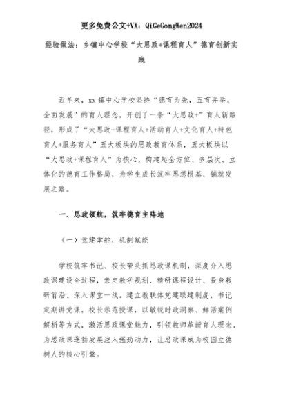 【七哥公文】2025年:经验做法:乡镇中心学校“大思政+课程育人”德育创新实践+更多免费公文+VX:QiGeGongWen2024+更多免费公文+VX:QiGeGongWen2024