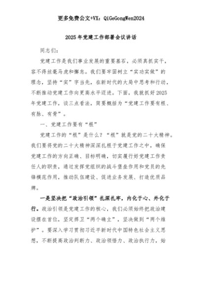 【七哥公文】2025年:2025年党建工作部署会议讲话+更多免费公文+VX:QiGeGongWen2024+更多免费公文+VX:QiGeGongWen2024