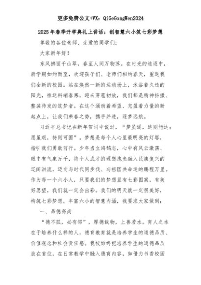 【七哥公文】2025年:2025年春季开学典礼上讲话:创智慧六小筑七彩梦想+更多免费公文+VX:QiGeGongWen2024+更多免费公文+VX:QiGeGongWen2024