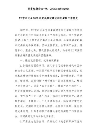 【七哥公文】2025年:XX市司法局2025年党风廉政建设和反腐败工作要点+更多免费公文+VX:QiGeGongWen2024+更多免费公文+VX:QiGeGongWen2024