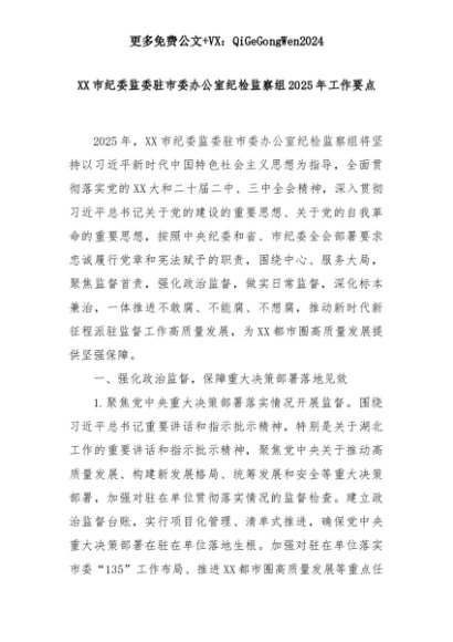 【七哥公文】2025年:XX市纪委监委驻市委办公室纪检监察组2025年工作要点+更多免费公文+VX:QiGeGongWen2024+更多免费公文+VX:QiGeGongWen2024