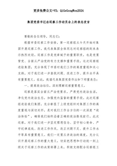 【七哥公文】2025年:集团党委书记在巡察工作动员会上的表态发言+更多免费公文+VX:QiGeGongWen2024+更多免费公文+VX:QiGeGongWen2024