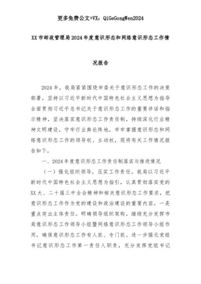 【七哥公文】2025年:XX市邮政管理局2024年度意识形态和网络意识形态工作情况报告+更多免费公文+VX:QiGeGongWen2024+更多免费公文+VX:QiGeGongWen2024