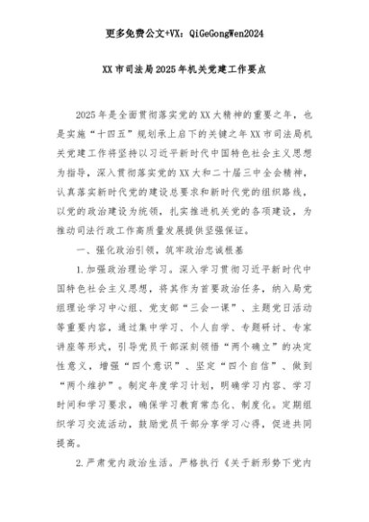 【七哥公文】2025年:XX市司法局2025年机关党建工作要点+更多免费公文+VX:QiGeGongWen2024+更多免费公文+VX:QiGeGongWen2024
