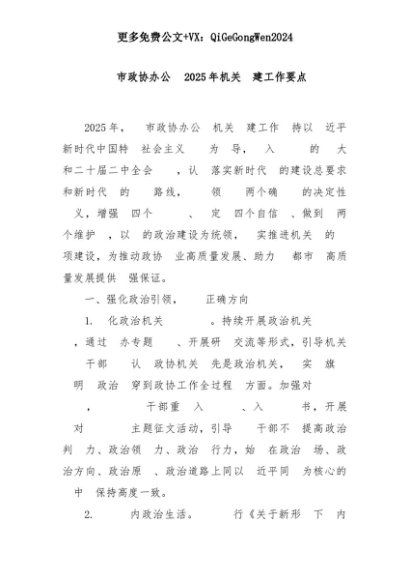 【七哥公文】2025年:XX市政协办公室2025年机关党建工作要点+更多免费公文+VX:QiGeGongWen2024+更多免费公文+VX:QiGeGongWen2024