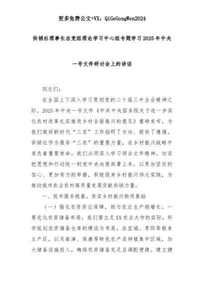 【七哥公文】2025年:供销社理事长在党组理论学习中心组专题学习2025年中央一号文件研讨会上的讲话+更多免费公文+VX:QiGeGongWen2024+更多免费公文+VX:QiGeGongWen2024