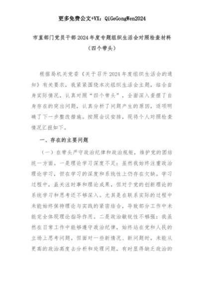 【七哥公文】2025年:市直部门党员干部2024年度专题组织生活会对照检查材料(四个带头)+更多免费公文+VX:QiGeGongWen2024+更多免费公文+VX:QiGeGongWen2024