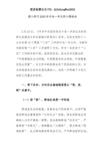 【七哥公文】2025年:深入学习2025年中央一号文件心得体会+更多免费公文+VX:QiGeGongWen2024+更多免费公文+VX:QiGeGongWen2024