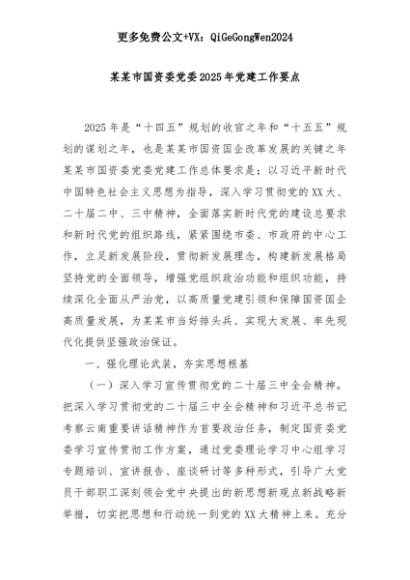 【七哥公文】2025年:某某市国资委党委2025年党建工作要点+更多免费公文+VX:QiGeGongWen2024+更多免费公文+VX:QiGeGongWen2024