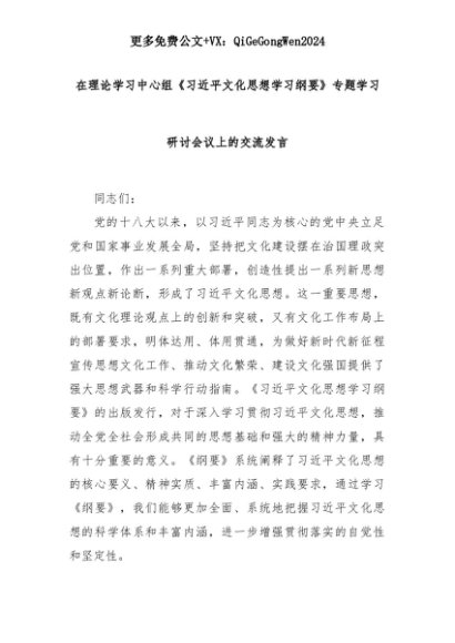 【七哥公文】2025年:在理论学习中心组《习 近 平文化思想学习纲要》专题学习研讨会议上的交流发言+更多免费公文+VX:QiGeGongWen2024+更多免费公文+VX:QiGeGongWen2024
