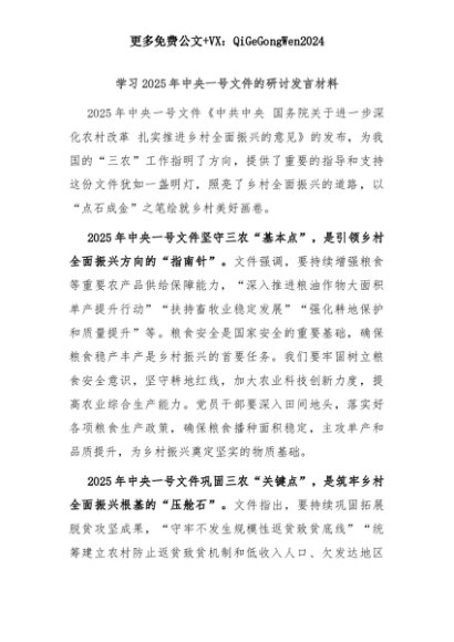 【七哥公文】2025年:学习2025年中央一号文件的研讨发言材料+更多免费公文+VX:QiGeGongWen2024+更多免费公文+VX:QiGeGongWen2024